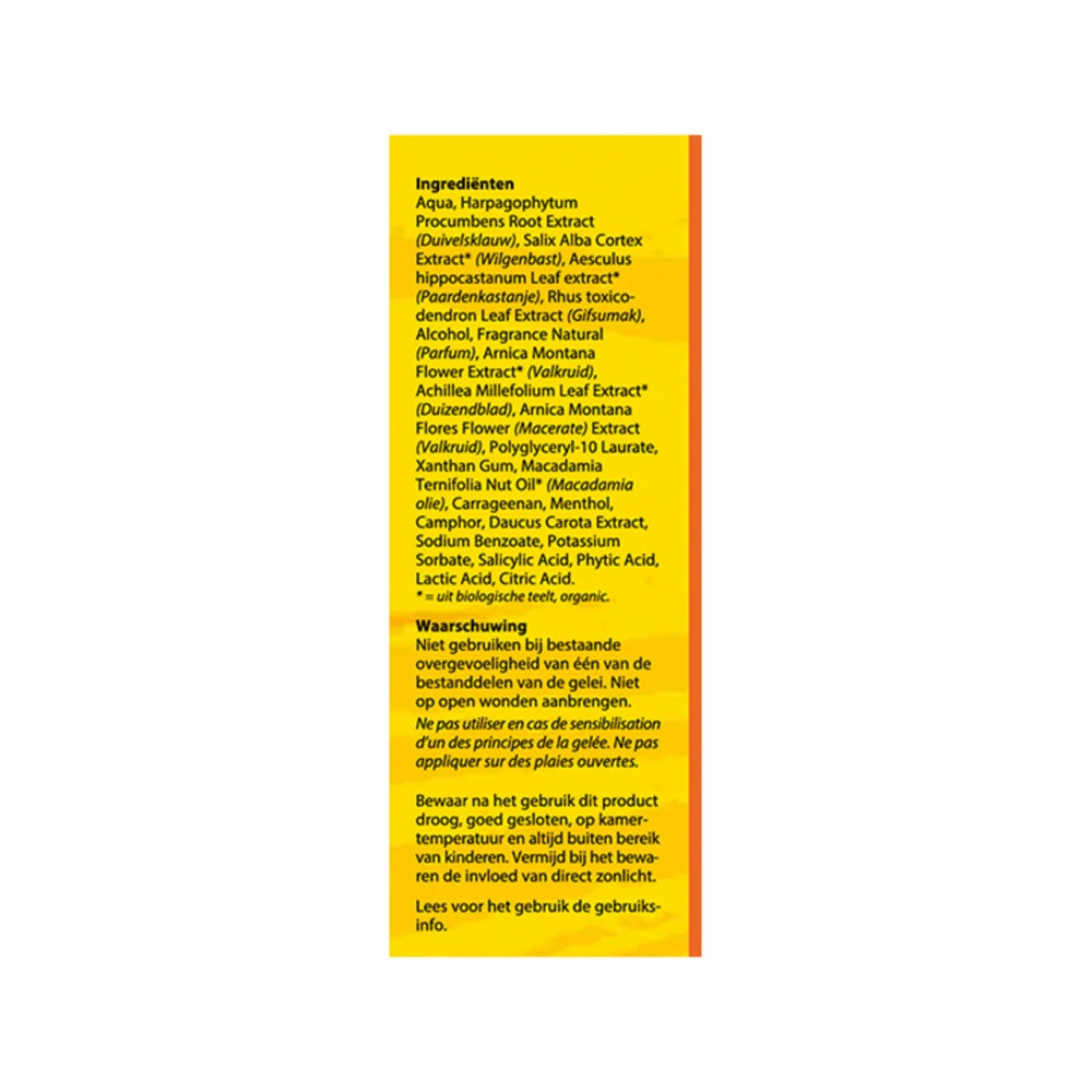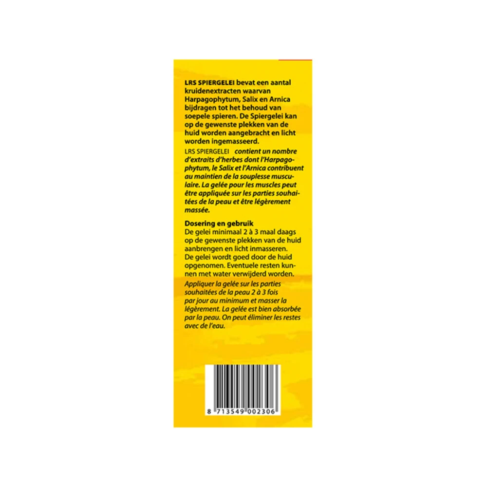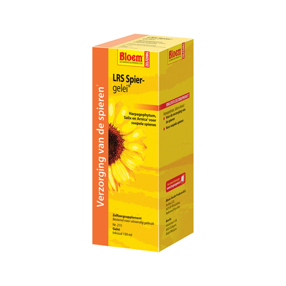 Bloem LRS Spiergelei voor de verzorging van de spieren*LRS spiergelei van Bloem bevat een aantal kruidenextracten waarvan Harpagophytum, Salix en Arnica bijdragen tot de verzorging en het behoud van soepele spieren. Harpagophytum, Salix en ArnicaVoor de verzorging van de spieren*Voor soepele spieren**Harpagophytum, Salix en Arnica