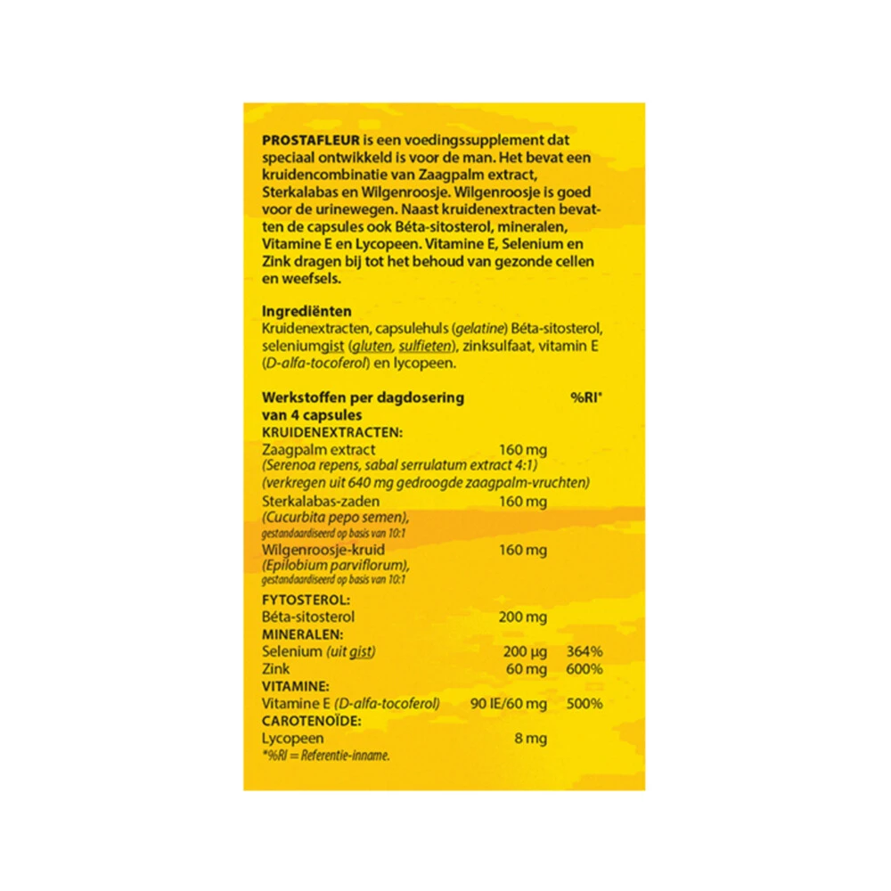 ProstaFleur Mannen FormuleBloem ProstaFleur nr 175 is speciaal ontwikkeld voor de man. ProstaFleur bevat wilgenroosje, dat een gunstig effect heeft op de urinewegen*. Naast kruidenextracten bevatten de capsules ook Béta-sitosterol, mineralen, Vitamine E en Lycopeen. Vitamine E, Selenium en Zink dragen bij tot het behoud van gezonde cellen en weefsels. * = Gezondheidsclaim in afwachting van goedkeuring door de Europese Commissie
