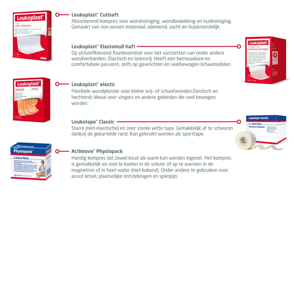 Leukoplast Sport PakketLeukoplast Sport Pakket is een specifiek samengesteld pakket om voorbereid te zijn op onverwachte kleine blessures. Het pakket bestaat uit 4 artikelen.Cutisoft verbandgaasElastomull haft fixatiewindselPleister ElastiekLeukotape Classic 10m x 3.75cmPhysiopack Hot/Cold Pack