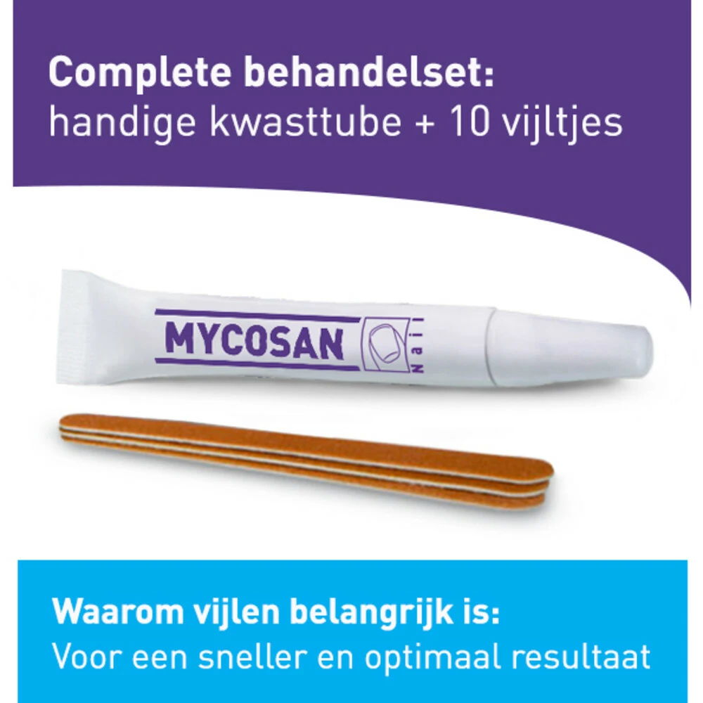 Mycosan Kalknagel Behandelset 10 mlDe Mycosan Kalknagel Behandelset is klinisch bewezen tot 100% effectief tegen schimmels die kalknagel veroorzaken met zichtbaar resultaat binnen twee weken. Mycosan Kalknagel Behandelset heeft een drievoudige werking: Het is een effectieve doelgerichte werkingHet dringt door in de nagel en herstelt de natuurlijke staat van de nagelVoorkomt (her-)besmetting door de vorming van een beschermend laagjeDe behandeling is gebaseerd op een gepatenteerd serum dat klinis
