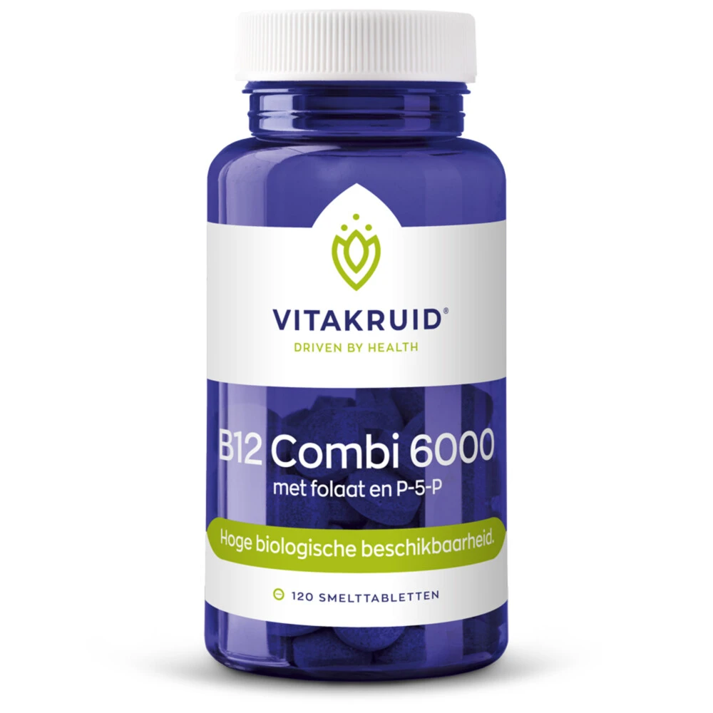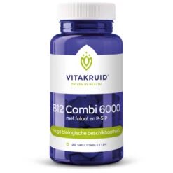 Vitakruid B12 Combi 6000Vitakruid B12 Combi is een hoogwaardige combinatie en heeft een aantoonbaar gunstige invloed op de vermindering van vermoeidheid en futloosheid*. Bovendien zorgt B12 Combi 6.000 voor een verbeterde functie van het zenuwstelsel, de aanmaak van rode bloedcellen en heeft het een rol in het cel vernieuwingsproces*. Vitamine B12 heeft een gunstige invloed op de vermindering van vermoeidheid en futloosheidVitamine B12 heeft een positieve invloed op het immuunsysteem, de ge