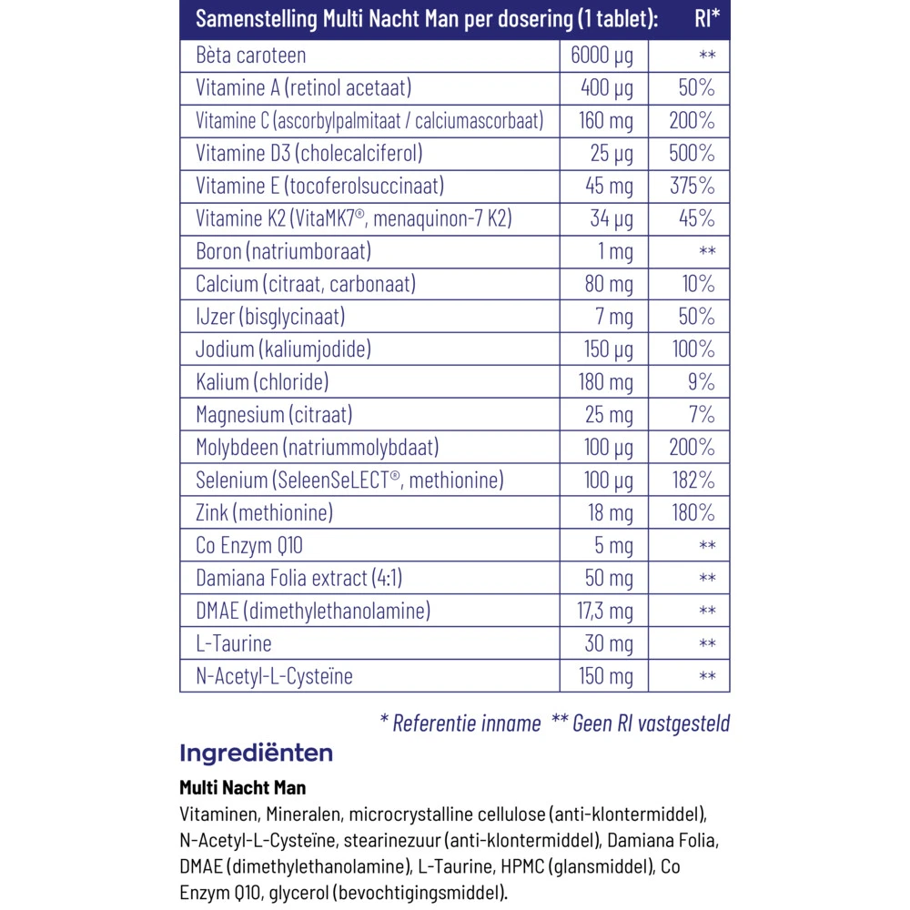 Vitakruid Multi Dag & Nacht ManVitakruid Multi Dag & Nacht Man is een formule op basis van het bioritme. Overdag, als je actief bent krijg je met Vitakruid Multi Dag & Nacht Man andere voedingsstoffen dan op het moment dat je slaapt. De tabletten geven energie voor overdag, rust voor de nacht.Twee tabletten voor optimaal dag- en nachtritme (bioritme)Uitsluitend de best opneembare vormenEen compleet vitamine B-complex die bijdragen aan het energieniveauVrij van GMO, Gluten, gist, lact