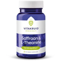 Vitakruid Saffraan & L-TheanineVitakruid Saffraan & L-Theanine is een voedingssupplement met een bijzondere gezondheid bevorderende eigenschap. Zo bevat dit supplement het hoogwaardige extract Affron, dat bijdraagt aan het behoud van een positieve gemoedstoestand wanneer de dagelijkse dosering 28mg bedraagt. Affron is vervaardigd uit 100% echte saffraan en gestandaardiseerd op 3.5% Lepticrosalides. Het complex is tevens verrijkt met L-Theanine. Dit is een biologisch product die voornamel
