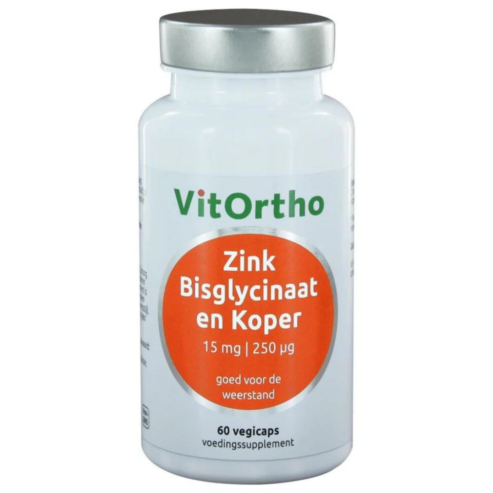 Vitortho Zink Bisglycinaat15 mgVitortho Zink Bisglycinaat15 mg bevat een combinatie van zink en koper in goed opneembare vorm. De vegacaps zijn optimaal gedoseerd en geschikt voor langdurig gebruik. Zink is goed voor het celdelingsproces, voor het behoud van gezonde cellen en weefsels en voor extra ondersteuning van de weerstand. Zink samne met koper helpt voor behoud van sterk en glanzend haar, normale nagels en sterke botten.Combinatie van zink en koper in goed opneembare vorm.Optimaal gedosee